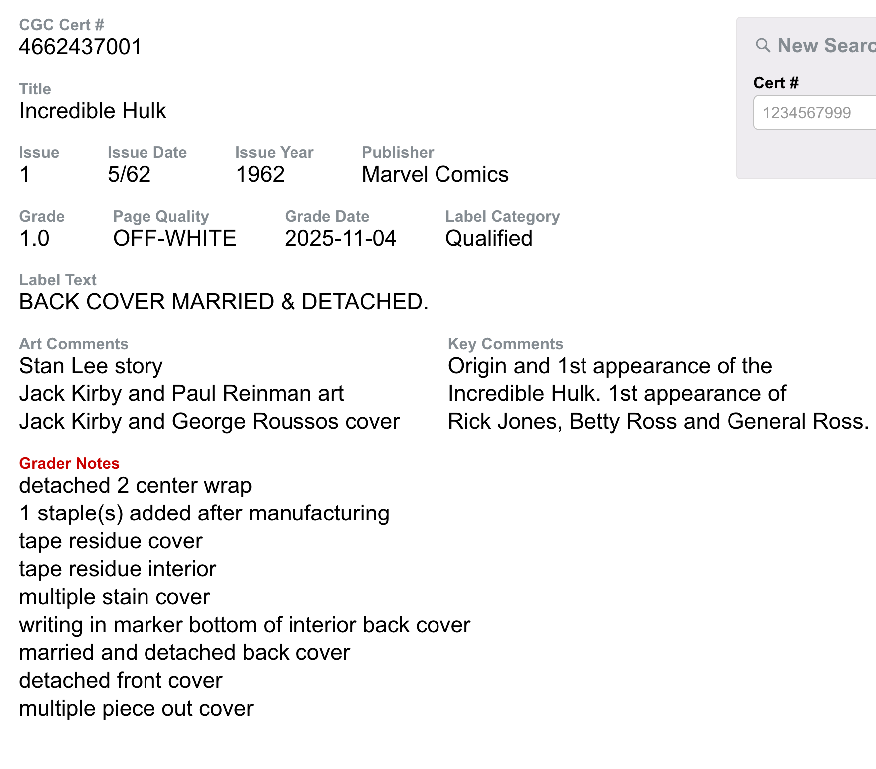 Incredible Hulk #1 1962 CGC 1.0 Qualified